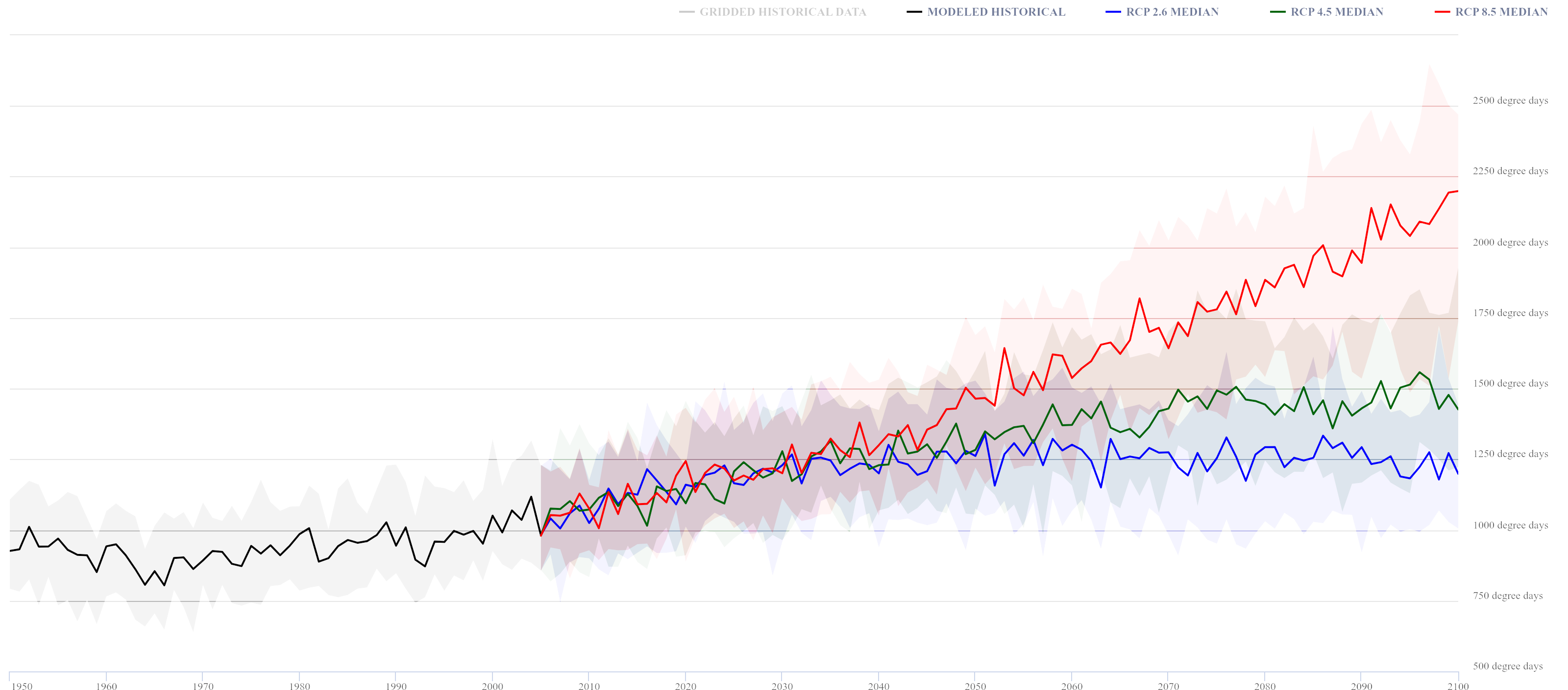 While module content focuses primarily on Canadian impacts, the global nature of climate change means that impacts around the world will likely have indirect effects on Canadian agriculture through changes in global supply chains and trade3,4. ClimateData.ca provides data from an ensemble of 24 global climate models which have been downscaled and bias adjusted using the ANUSPLIN-derived gridded historical dataset. Consequently, only maximum and minimum temperature and precipitation, and several climate indices based on these three variables, are currently available. Survey results indicated that wind, soil moisture and snow cover information is also required by stakeholders; unfortunately, it is not currently possible to provide these variables on ClimateData.ca. The Learning Zone section of ClimateData.ca provides further information on historical datasets, using climate data for decision making, and climate projection ranges.
