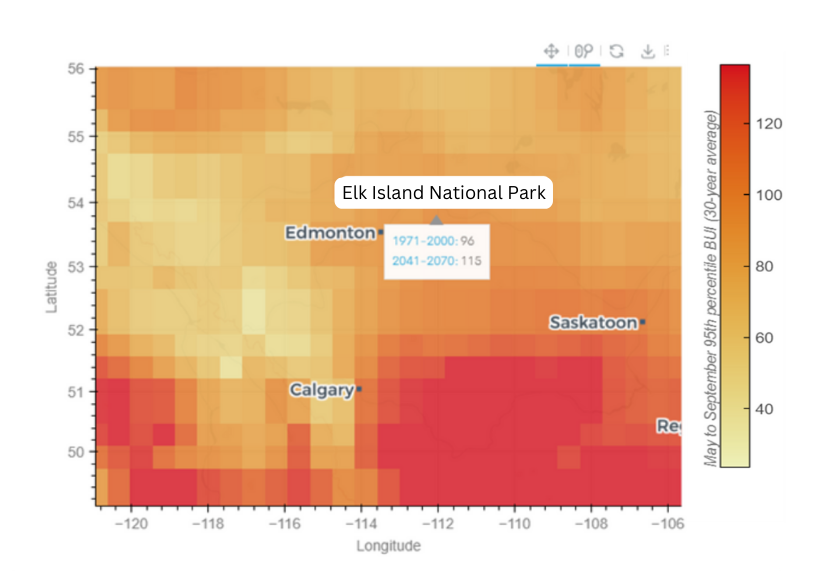 In this case, we are looking at how the fire season length is expected to change in Waterton Lakes National Park, in a high emissions scenario (RCP8.5), by mid-century (2041-2070). Zooming into the map and hovering over a region close to the park reveals the following historical map: