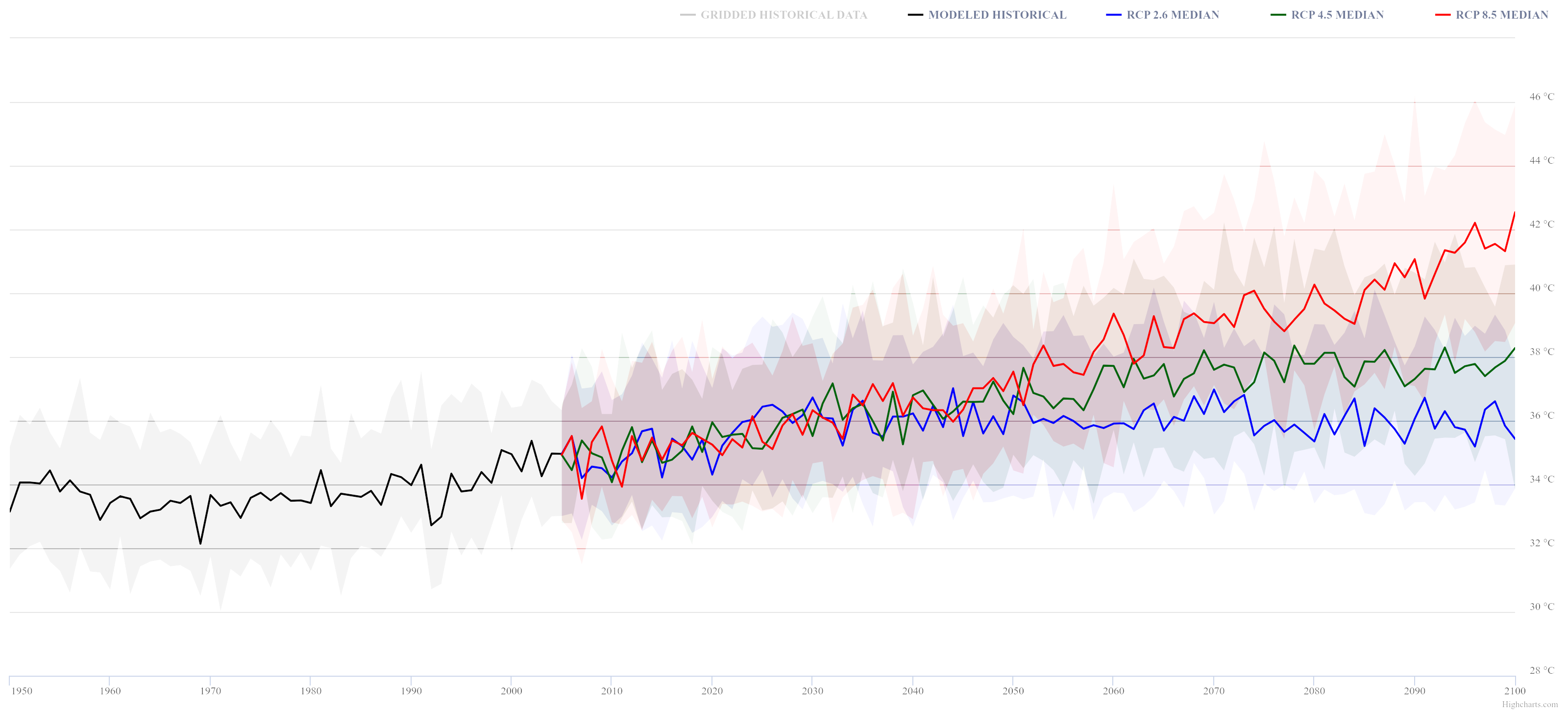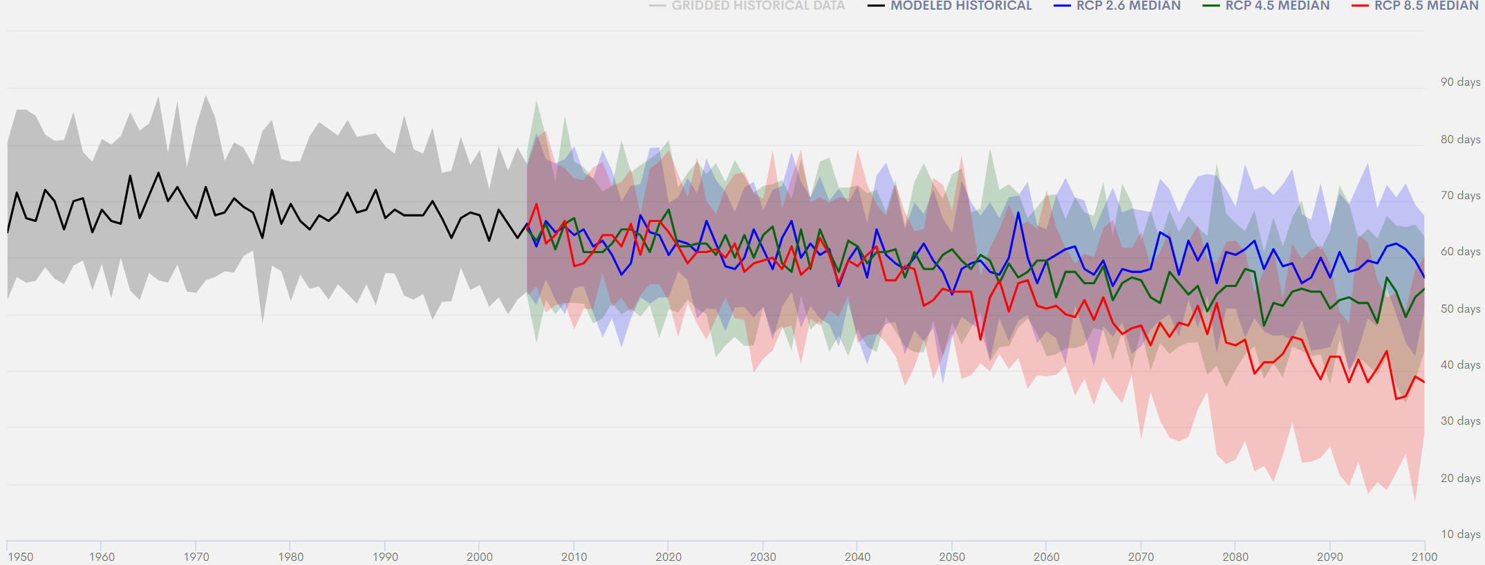 Freeze-thaw cycles, in which snow melts and then re-freezes as ice, can lead to bus collisions and slips and falls on outdoor platforms, stations, sidewalks, and parking lots. As winters warm, freeze-thaw cycles in Toronto may decrease in frequency over the long-term and under higher emissions scenarios, but are projected to persist at a similar frequency to historical conditions under low (RCP2.6) and intermediate (RCP4.5) emissions scenarios (Figure 2). There are a number of tools available to address this problem, including snow removal, salting, and infrastructure that melts snow on contact. This has knock-on considerations for transit stations: should Metrolinx install heating systems to melt snow on platforms, or continue to rely on snow clearing and salt management? The former is not cheap, and would have a negative impact by increasing greenhouse gas emissions, as they have traditionally used natural gas boilers. How does this compare to improved salting of platforms? Metrolinx utilizes both strategies depending on a variety of factors and local context, including energy efficiency. They are investigating energy options (e.g., natural gas vs electricity) for platform snow melting systems, and the use of improved weather forecasting to inform snow clearing and salt management practices. How these options are impacted by climate change in the intermediate (10 year) and long-term (asset lifecycle) is also an important consideration.