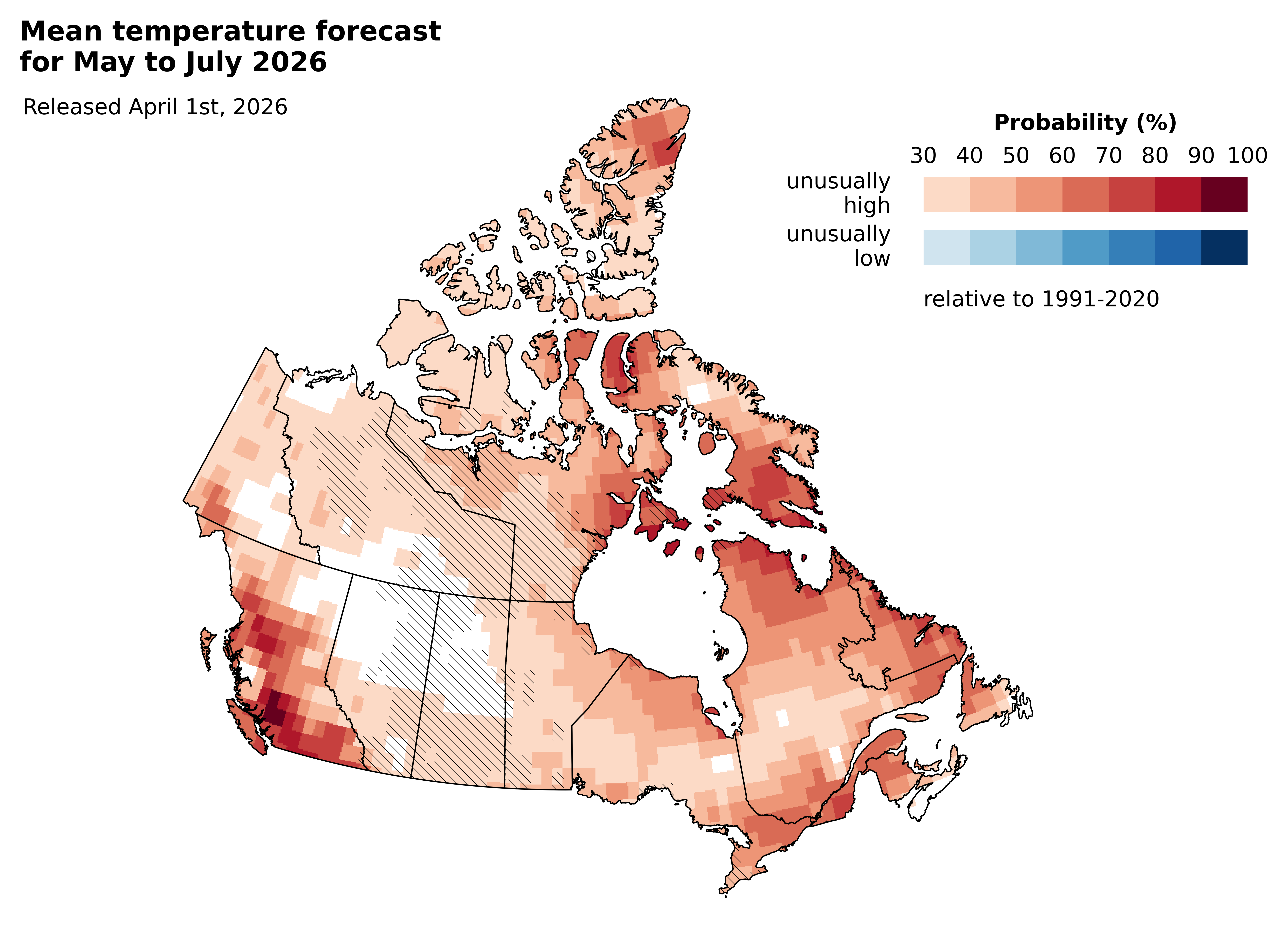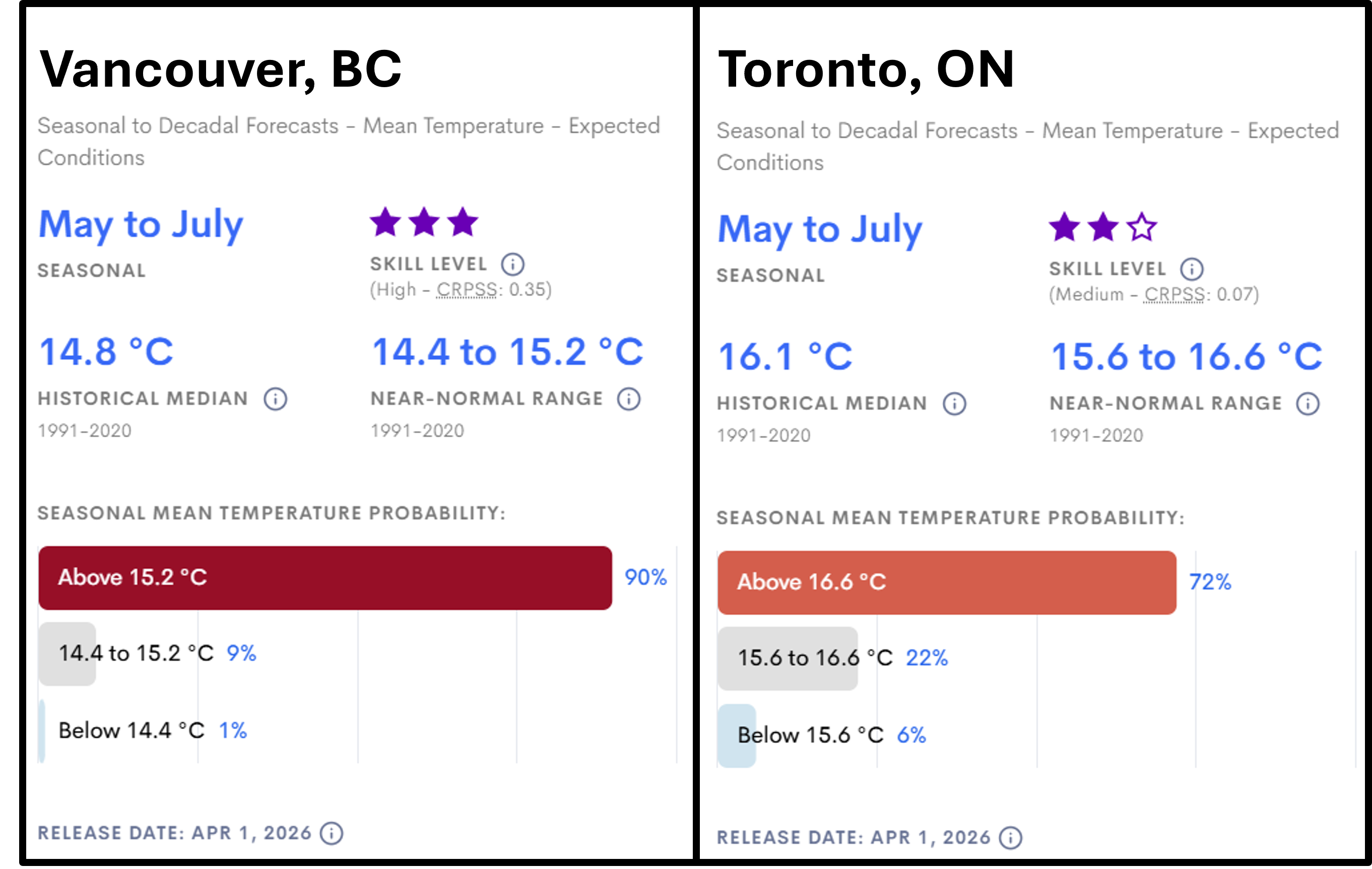 With around two months until the World Cup, the seasonal forecast for May to July 2026 tells us that there is a 90% chance that the average temperature in Vancouver will be warmer than normal2. In Toronto, the probability that the average temperature for May to July 2026 will be warmer than normal is 72% (Figure 2).
