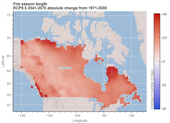 Below is an example of what the application can display. This map shows the absolute change in projected fire season length in Canada for the 30-year period 2041-2070, compared to the average fire season length for the baseline period 1971-2000, in a high emissions scenario (RCP8.5). Read more about emissions scenarios here: Emissions Scenarios: RCPs — ClimateData.ca.