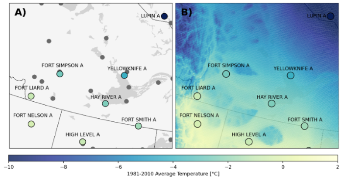 Figure 2. Illustrative example around Yellowknife of how weather station data can be interpolated to transform station data into gridded data. A) AHCCD stations noted with filled and outlined grey circles, with the average temperature for 1981-2010 noted by colour filled circles where available. B) The same AHCCD data points overlayed on the historical gridded dataset, NRCANMet, which is based on quality-controlled, unadjusted station data.