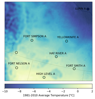 Figure 3. Average temperature around Yellowknife for 1981-2010 from ERA5-Land. Average temperatures for the same period from AHCCD stations show in black circles.