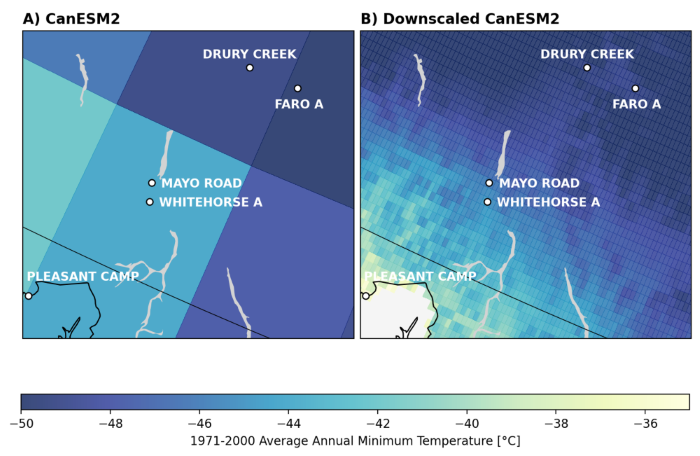 Figure 4. Illustrative example of downscaling climate model output around Whitehorse, YT, for 1981-2010 average annual minimum temperatures. (A) shows global climate model output from CanESM2, and (B) shows CanESM2 results that have been downscaled using NRCANMET data. White circles show AHCCD stations in the area.
