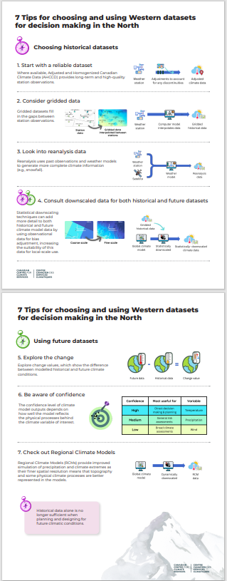 The article Overview of Available Western Science-based Climate Data for Northern Canada introduces Western climate datasets available for the North, while Getting Started with Western Science-based Climate Data for Northern Canada provides general tips for using climate data. This article goes into more depth with seven best practices for choosing and using historical data and future climate data in the North. While the climate datasets on ClimateData.ca are based on Western scientific techniques, the partners behind the platform recognize the value of Indigenous Science and Knowledge Systems for supporting Indigenous-led adaptation planning. In this context, Western climate science can be considered as an additional piece of information to support Indigenous Peoples, and their self-determined climate actions.