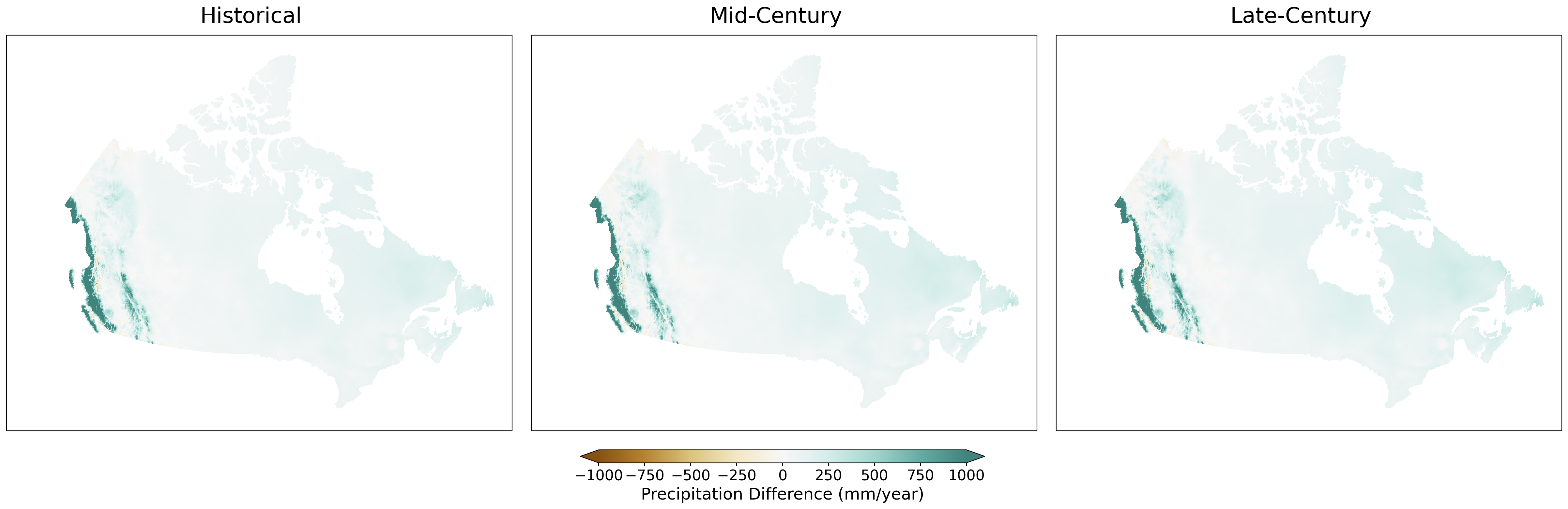 A target dataset is a set of high-resolution historical data used to adjust climate model simulations to better reflect local climate conditions.U6 uses NRCANmet V1 as the target dataset3,4. This dataset is produced by Natural Resources Canada, and is available at a gridded spatial resolution of approximately 6 x 10 km (it is also commonly referred to as “ANUSPLIN”).M6 uses an improved target dataset, PCIC-Blend, which has the same spatial resolution as NRCANmet. This dataset was developed by the Pacific Climate Impacts Consortium (PCIC) by combining pre-existing datasets that each have their own advantages in certain parts of the country. PCIC-Blend combines PNWNAmet over western Canada (daily maximum and minimum temperature, precipitation) with NRCANmet V2 (daily maximum and minimum temperature) and NRCANmet-Adjusted (precipitation) over central and eastern Canada3. The three datasets were smoothly blended over a transition region east of the Rocky Mountains from the Arctic Ocean to the US border. While the NRCANmet datasets provide a good description of these variables over central and eastern Canada, PNWNAmet performs better in the west when compared to station observations.Learn more about the M6 dataset by reading the article, Multivariate Canadian Downscaled Climate Scenarios for CMIP6 (CanDCS- M6).