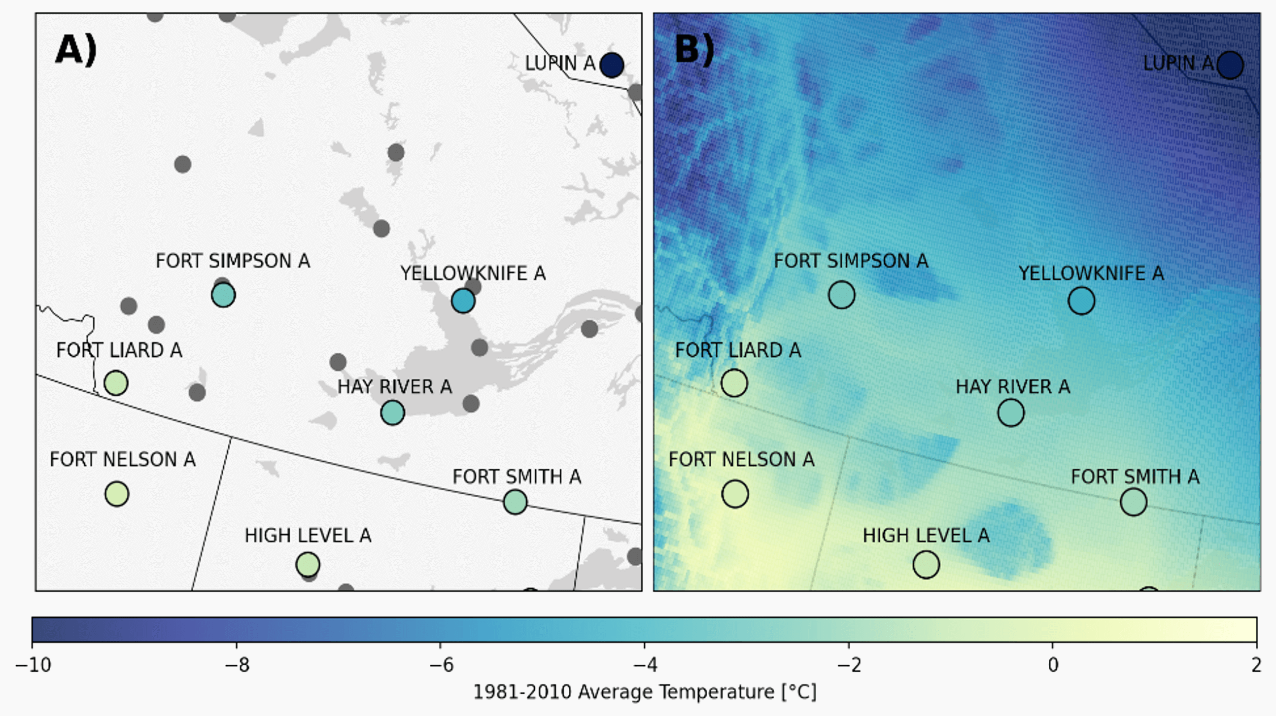 Figure 3. Illustrative example, around Yellowknife, of how weather station data can be interpolated, to transform station data into gridded data. A) AHCCD stations noted in grey circles, with the average temperature from 1981-2010 shown in coloured circles where available. B) The historical gridded data (NRCANmet) based on station data.