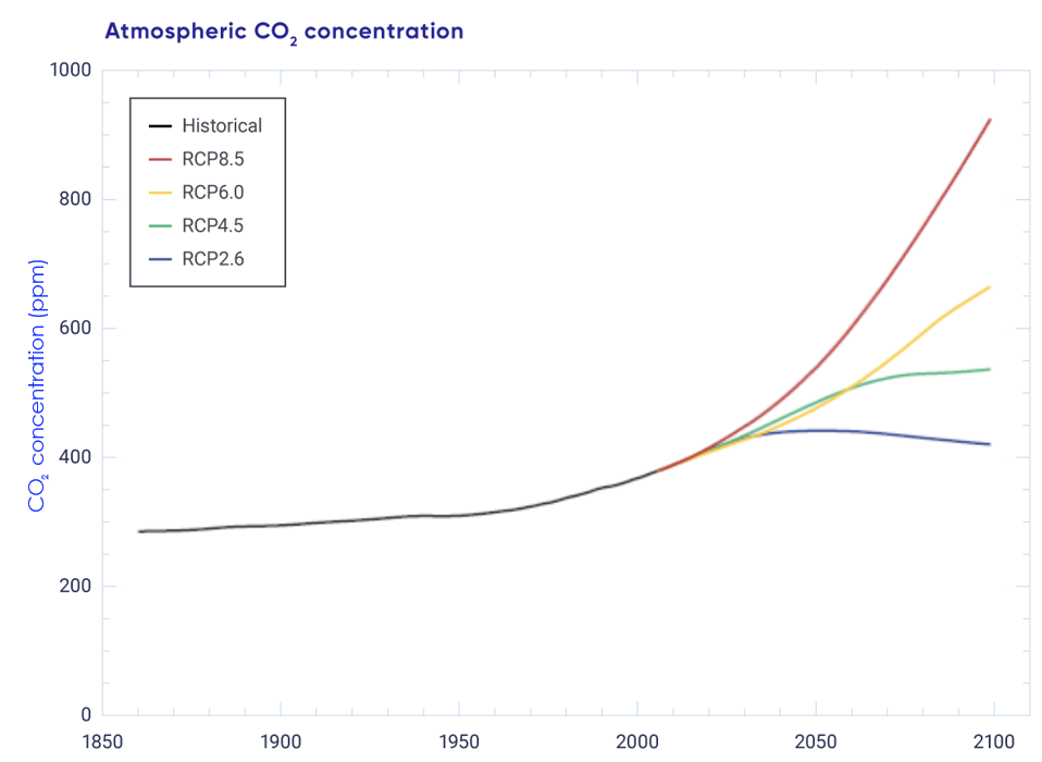 Figure 5. CCCR 2019 Figure-3.7 1: Carbon dioxide concentrations under the four Representative Concentration Pathways for CMIP5 models.