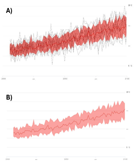 Figure 6. Temperature projections for a high emissions scenario (RCP8.5). The black lines in (A) show each individual model, with the red shaded area indicating the 10th – 90th percentile values and the red line showing the median (50th percentile) in (A) and (B).