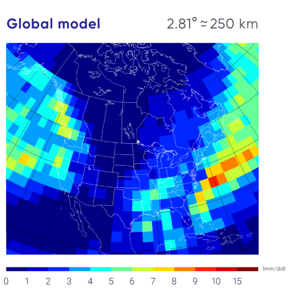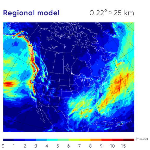 Regional climate models (RCMs), such as CanRCM and the Weather Research and Forecasting Model (WRF), generate climate information over smaller regions, typically at resolutions of 50 by 50 km or smaller. Since they operate at a finer spatial scale than GCMs, RCMs generally represent the landscape (underlying topography) of a region more accurately. Improved spatial resolution also means that some RCMs can model certain climate processes, and therefore climate variables, more effectively. For example, RCMs generally have improved local precipitation projections compared to GCMs. Copernicus’ Interactive Climate Atlas6 is a great portal for interacting with and visualizing regional climate data.