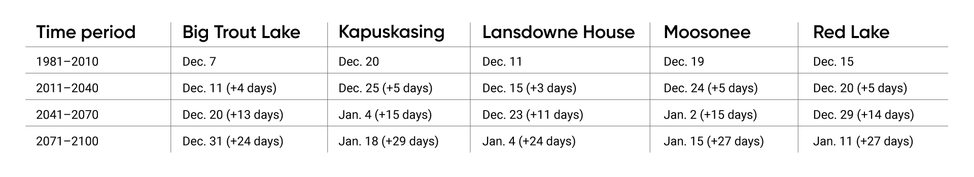 Using the freezing degree day (FDD) accumulation criteria outlined above, there are years in Figure 1 in which the start dates for ice road construction appear to be delayed in the gridded historical (ANUSPLIN) datasets (shown in orange). It also appears that the variability in the timing of reaching the FDD accumulation threshold is increasing in the latter portion of the gridded historical record for several locations, particularly for Kapuskasing and Moosonee. Examination of the climate model simulations, however, shows that comparable conditions are not projected to occur until mid-century and beyond.